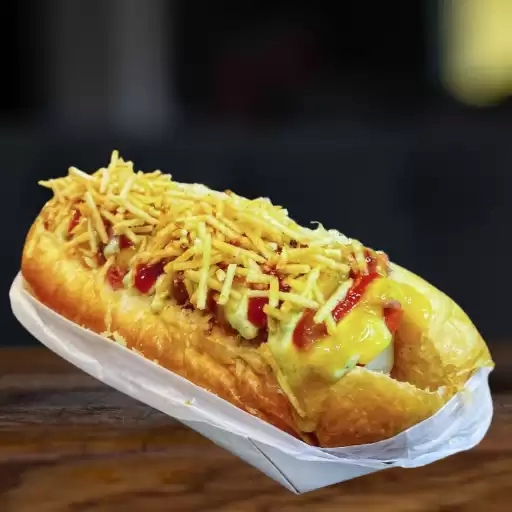 Pão, salsicha, queijo, presunto, ovo, bacon, vinagrete, ervilha, milho, batata e molho